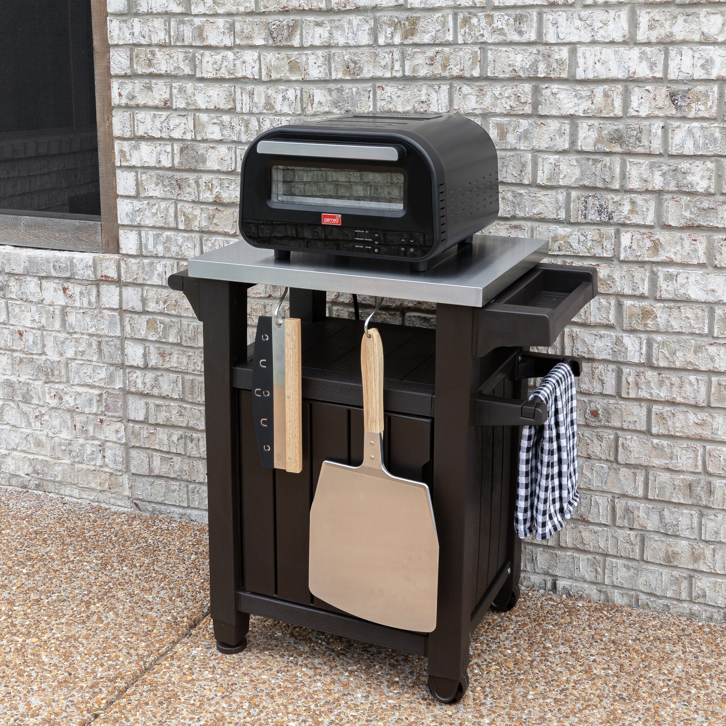 The Gemelli Home Pizza Oven comes fully equipped to start making pizzas right away. Includes: Pizza Stone, Rocking Pizza Cutter, Pizza Peel and Pizza Pan.